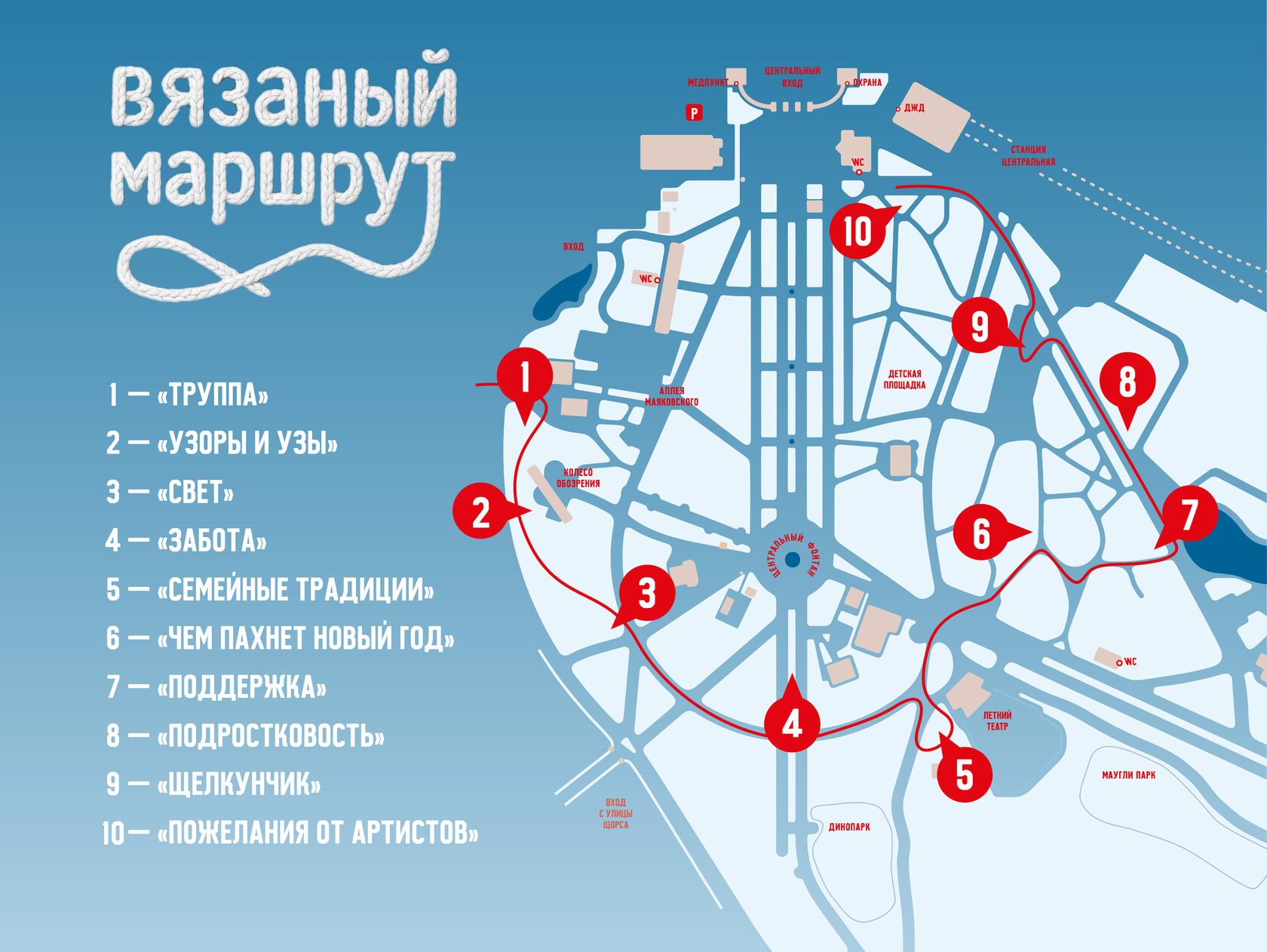 🧣 Надевайте на прогулки тёплые вязаные вещи, гуляйте по парку, ищите арт-объекты на маршруте, слушайте аудиоспектакль, делайте фото и отмечайте на них парк Маяковского и театр «Щелкунчик».